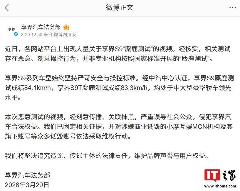 今年3月,享界汽车法务部已发布声明,指出网络上流传的大量关于享界S9“麋鹿测试”的视频存在问题。经核实,这些测试并非由专业机构按照国家标准开展,而是存在明显的恶意操控行为。声明强调,享界汽车始终秉持严谨、专业的态度对待每一项测试,坚决反对任何形式的造假行为。