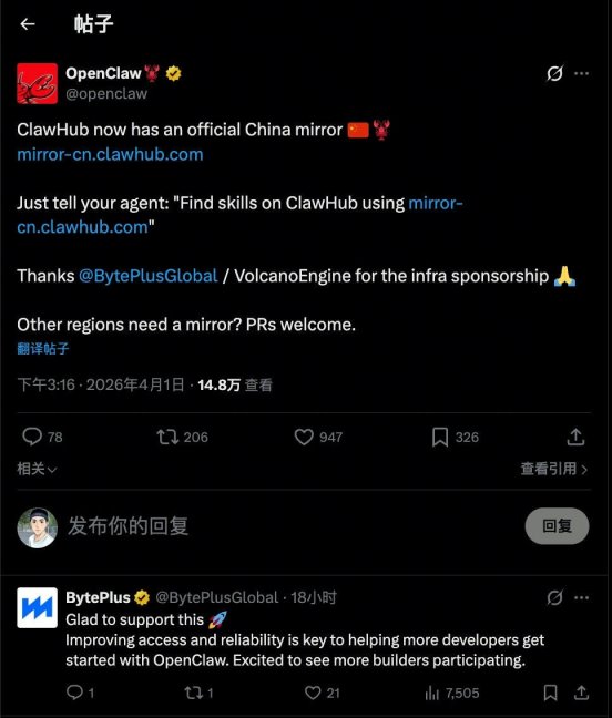 OpenClaw在X平台官宣:在火山引擎的支持下,ClawHub中国镜像站正式启动运营!点击 http://mirror-cn.clawhub.com/ 可以直接跳转到该镜像站。