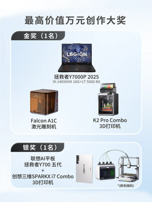 将原创3D模型上传至「创想云社区」参赛专区并提交材料。大赛设置金、银、铜及优秀、创意等多重奖项,奖品包含联想拯救者Y7000P笔记本电脑、联想AI平板拯救者Y700五代、创想三维K2 Pro Combo、创想三维Falcon A1C、创想三维SPARKX i7 Combo等丰富生态装备。