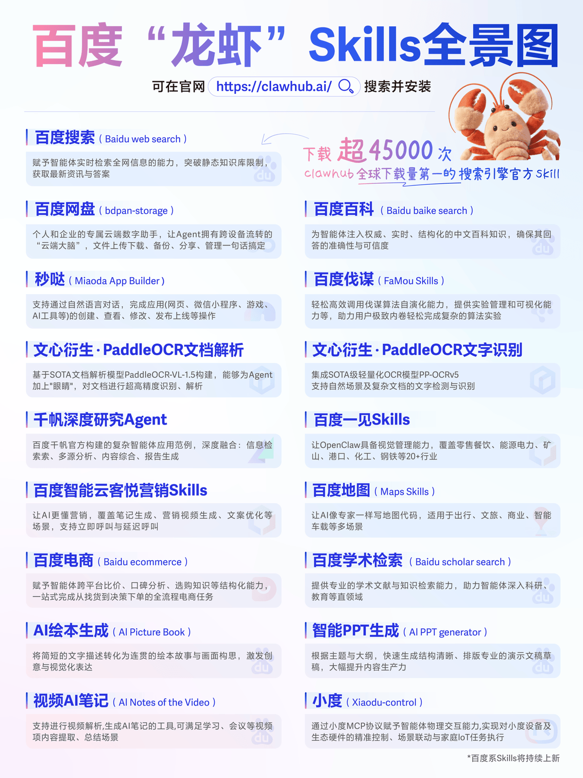 在近日举办的AI DAY主题活动上,百度以“龙虾”生态为核心推出多款创新产品,涵盖智能办公、家庭场景及开发者工具领域,同步发布多项技能插件(Skills)以完善OpenClaw生态布局。此次活动标志着百度在智能体应用领域的全面发力,通过降低技术使用门槛推动AI技术普惠化。