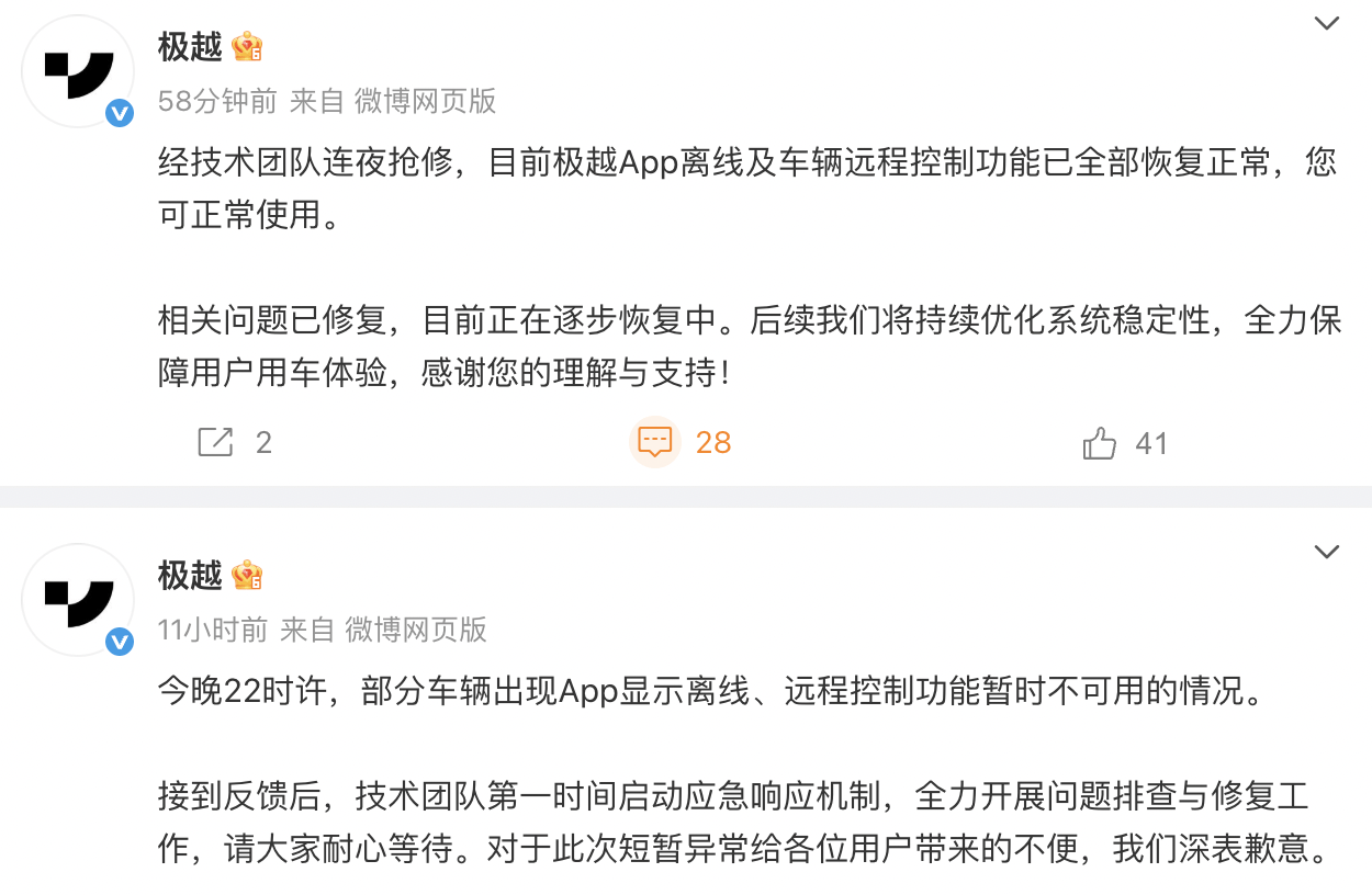经过技术团队连夜抢修,次日上午,极越汽车方面宣布,App离线及车辆远程控制功能已全部恢复正常,用户可正常使用。极越方面表示,相关问题已得到修复,后续将持续优化系统稳定性,以保障用户用车体验。
