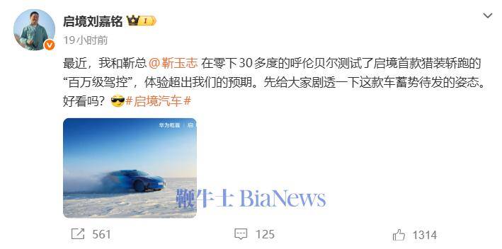 就在宣布新车亮相计划的前一天,启境汽车CEO刘嘉铭在社交媒体上透露,他近期与华为智能汽车解决方案BU CEO靳玉志一同前往零下30多度的呼伦贝尔,对这款猎装轿跑的“百万级驾控”系统进行了极端环境测试。刘嘉铭表示,实际体验远超预期,无论是车辆的操控稳定性还是智能系统的响应速度,都展现出了极高的水准。