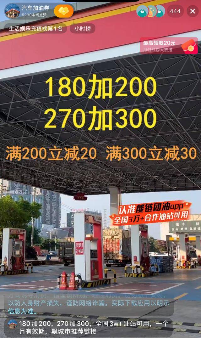 国内成品油价格迎来年内最大幅度上调后,短视频平台上涌现出大量以“加油优惠”为卖点的直播间。某直播间主推的“180元团200元”“270元团300元”加油代金券,仅两款产品累计销量已接近10万单,月销售额突破2500万元,甚至登上平台“生活娱乐充值榜”榜首。然而,这些看似诱人的优惠背后,却暗藏诸多消费陷阱。
