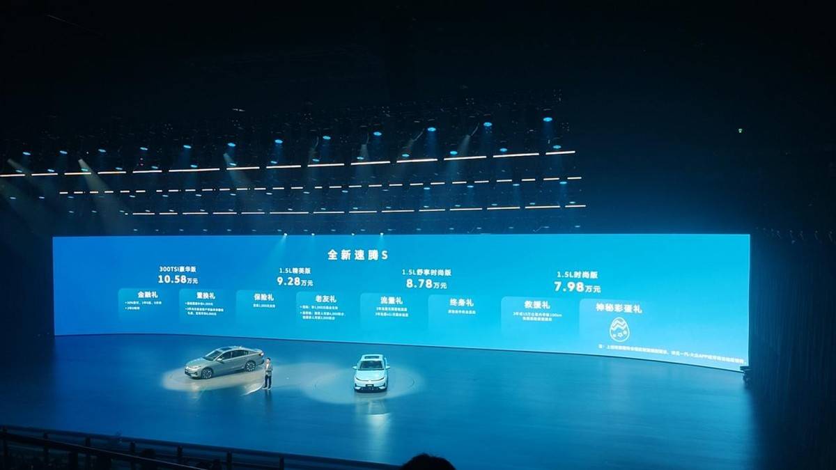 速腾S的定价策略成为发布会焦点。这款定位A+级市场的车型以7.98万元至10.58万元的价格区间入市,将速腾家族的准入门槛首次拉至8万元以下。尽管速腾品牌在中国市场累计销量已突破450万辆,但此次价格调整标志着其战略重心从“德系品质标杆”向“性价比突围”转变。新车尺寸为4702mm车长、2688mm轴距,较现款速腾L略有缩减,直接对标日产轩逸、大众朗逸等竞品。智能化配置成为核心卖点:12.9英寸中控屏与10.25英寸液晶仪表组成双联屏,搭载高通8155芯片的车机系统集成科大讯飞语音及DeepSeek、豆包等AI大模型,支持近800项语音控制功能。动力系统提供1.5L+6AT与1.5T EVO2+7速DSG双选择,其中1.5T版本最大功率118kW、峰值扭矩250N·m,兼容92号汽油的特性精准契合家庭用户通勤需求。