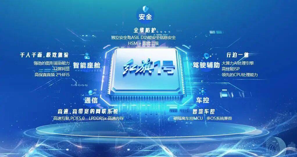 “红旗 1 号”并非传统单一功能芯片,而是一款专为智能汽车中央计算架构打造的多域融合处理器。它打破了以往多个独立芯片分别完成不同功能的模式,创新性地将驾驶辅助、智能座舱、车身车控、通信与安全五大功能域集成于一颗芯片之上,真正达成了“舱、驾、控”一体化的目标。